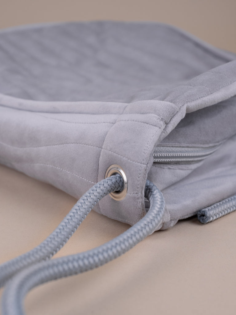 Flauschig weich kommt er um die Ecke, denn er ist aus einem sehr weichen Samtstoff und zusätzlich wattiert. Durch das handgesteppte Muster bekommt diese Serie das gewisse Etwas und wirklich jede Tasche ist ein Unikat. Die Tasche lässt sich mit einem langen Reißverschluss maximal weit öffnen und die Kordeln kannst du durch einen einfachen Knoten beliebig in der Länge verstellen.