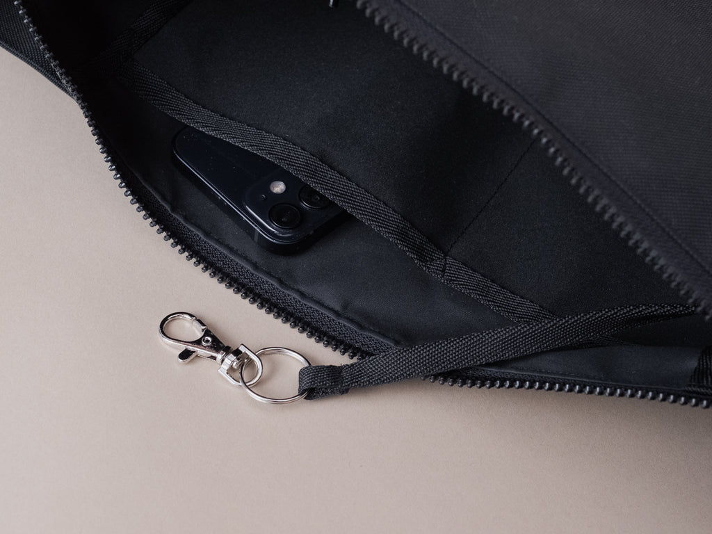 Stauraum Beispiel: Buch, Trinkflasche, Handy, Portemonnaie, Schlüssel, Snacks.