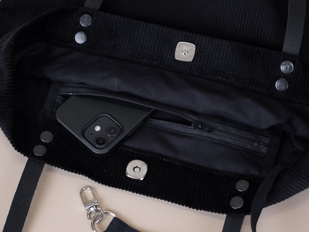• Innentaschen mit Reißverschluss, Band mit Karabiner für Schlüsselbund, Magnetverschluss